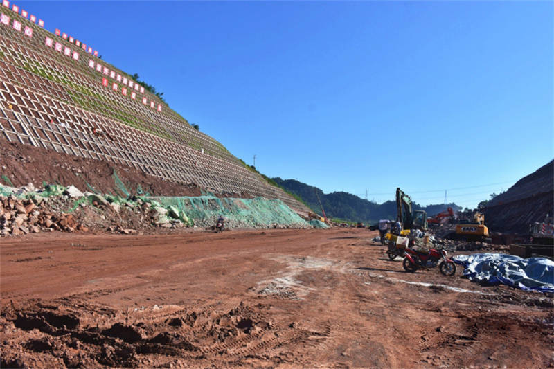 在金雞關(guān)開挖現(xiàn)場(chǎng),貨車往來(lái)運(yùn)輸著物料,挖掘機(jī)、吊車等各司其職,在機(jī)械和車輛碾壓下,土路基已較為平坦,道路初具雛形。