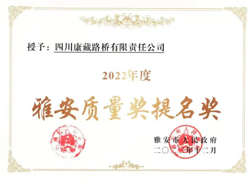 近日,雅安市人民政府根據(jù)《雅安質(zhì)量獎(jiǎng)評(píng)審管理辦法》相關(guān)規(guī)定,公布了“2022 年度雅安質(zhì)量獎(jiǎng)”,交建路橋榮獲“2022 年度雅安質(zhì)量獎(jiǎng)提名獎(jiǎng)”稱(chēng)號(hào)。