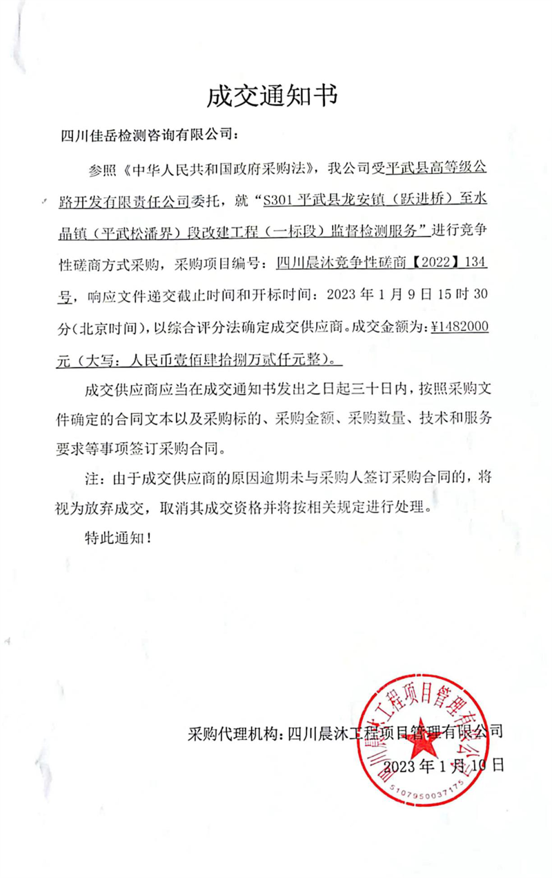 新年新業(yè)績 兔年新氣象 四川佳岳檢測咨詢有限公司中標首個市外檢測項目