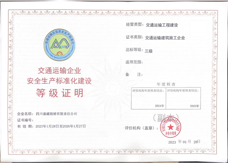 近日,經四川省交通運輸企業(yè)安全生產標準化評價機構綜合評定,雅安交建集團四川康藏路橋有限責任公司順利通過安全標準化三級評價驗收并獲得“安全生產標準化三級企業(yè)”等級證明證書。