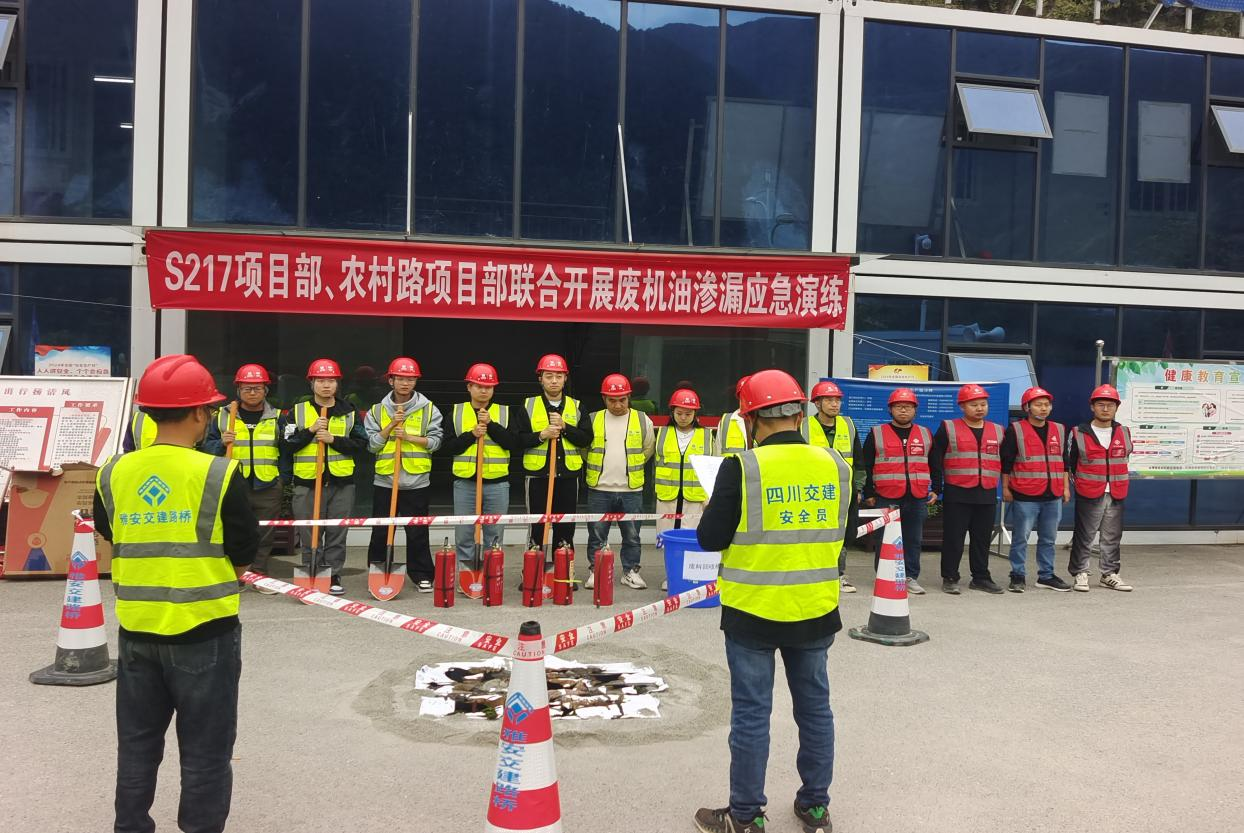 為提高項目管理人員與勞務(wù)人員應(yīng)對廢機油滲漏突發(fā)事件的能力,10月25日,雅安交建集團路橋公司S217石棉縣王崗坪至石棉縣城段災(zāi)后恢復重建工程項目部、“9.5”瀘定地震石棉縣受損農(nóng)村公路災(zāi)后恢復重建工程項目部、石棉縣農(nóng)村公路改造提升工程項目部,聯(lián)合開展環(huán)保廢機油處置應(yīng)急演練。