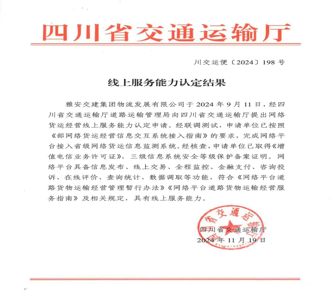 近日,《四川省交通運輸廳線上服務能力認定結(jié)果》發(fā)布,雅安交建集團物流發(fā)展有限公司正式取得網(wǎng)絡貨運經(jīng)營線上服務能力認定,標志著雅安首家國企網(wǎng)絡貨運平臺即將面向市場運營。