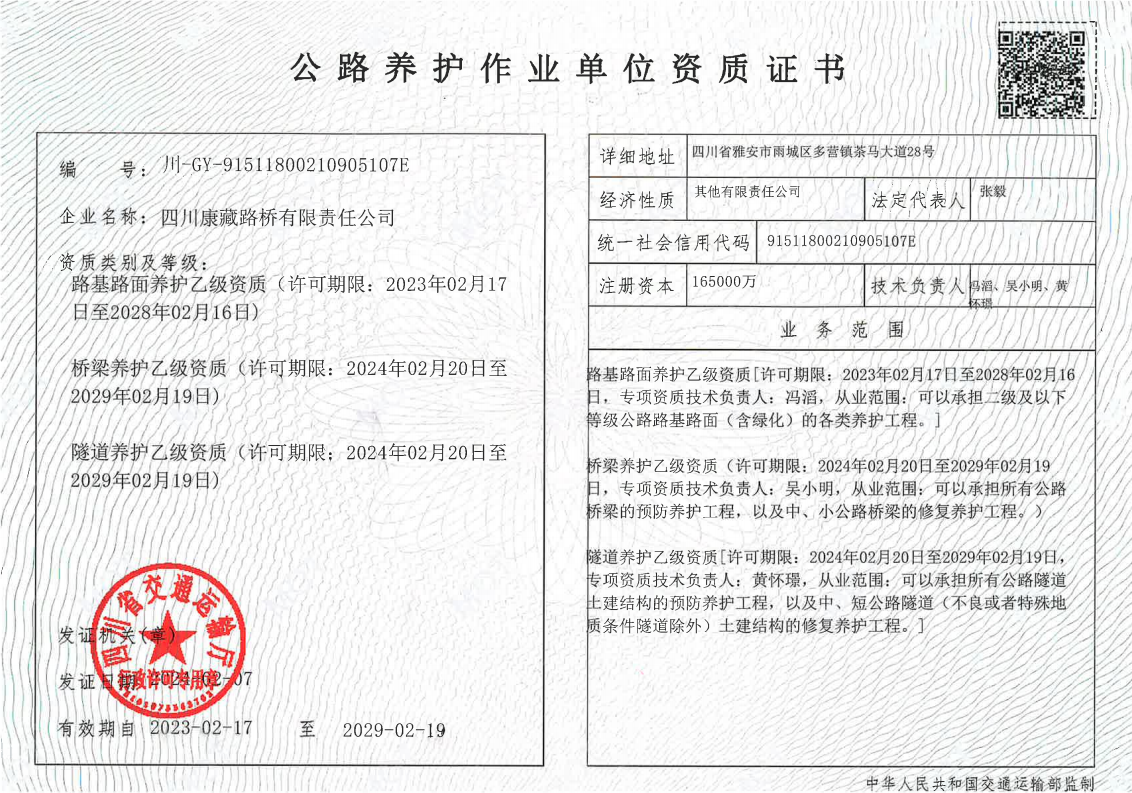 近日,雅安市交通建設(shè)(集團(tuán))有限責(zé)任公司通過自主申報,成功通過四川省交通運(yùn)輸廳公路養(yǎng)護(hù)作業(yè)單位資質(zhì)評審,完成公路養(yǎng)護(hù)作業(yè)單位資質(zhì)增項(xiàng),新增橋梁養(yǎng)護(hù)乙級、隧道養(yǎng)護(hù)乙級兩項(xiàng)資質(zhì)。