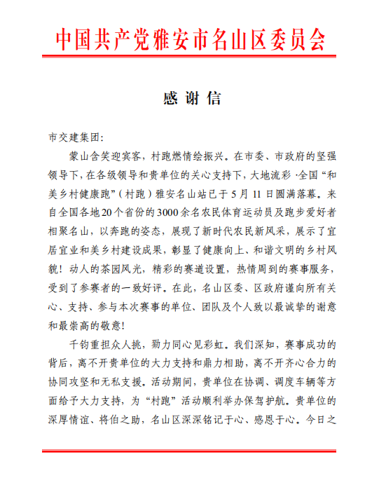 5月10日至11日,以“心向和美 逐夢茶源”為主題的大地流彩·2025年全國和美鄉(xiāng)村健康跑(村跑)雅安名山站活動在雅安市名山區(qū)成功舉辦。四川蜀通運(yùn)業(yè)有限責(zé)任公司作為運(yùn)輸保障單位,圓滿完成賽事期間各項運(yùn)輸保障任務(wù),為活動的順利開展提供了堅實保障,受到名山區(qū)委、區(qū)政府感謝信。
