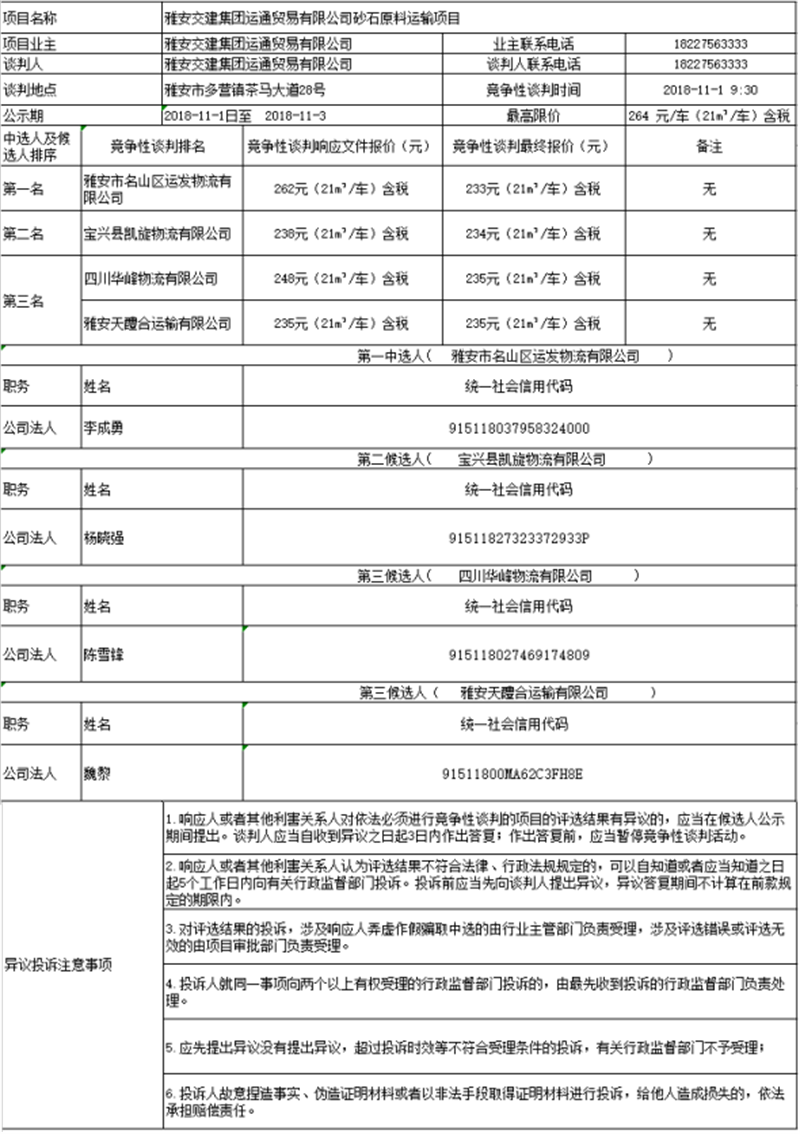 雅安交建集團(tuán)運(yùn)通貿(mào)易有限公司砂石原料運(yùn)輸項目競爭性談判中選人及候選人公示