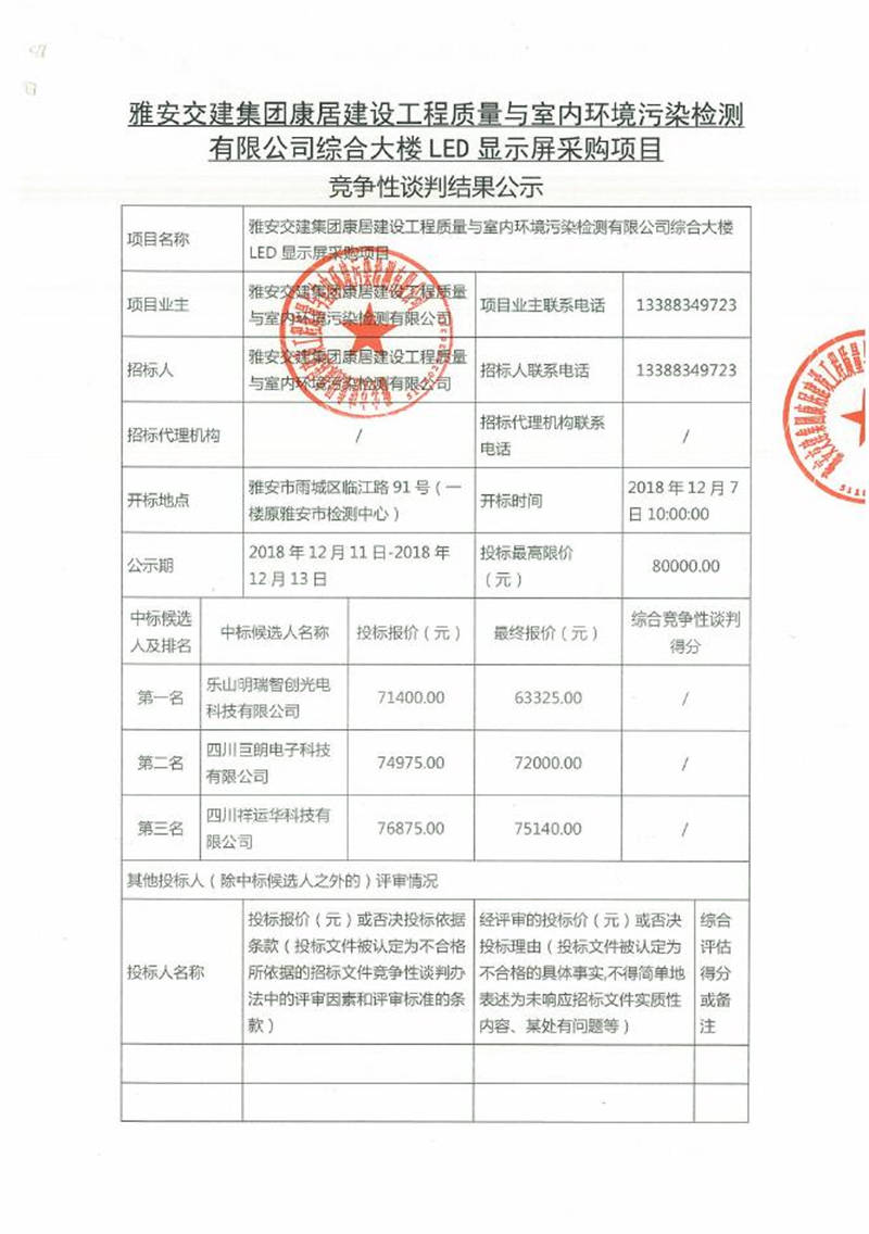 綜合大樓LED顯示屏采購項(xiàng)目競爭性談判結(jié)果公示