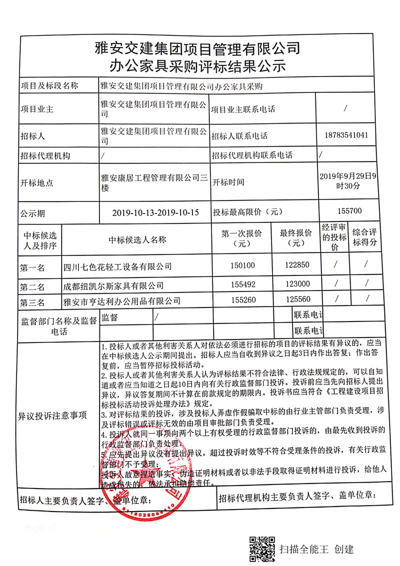 雅安交建集團(tuán)項目管理有限公司辦公家具采購評標(biāo)結(jié)果公示