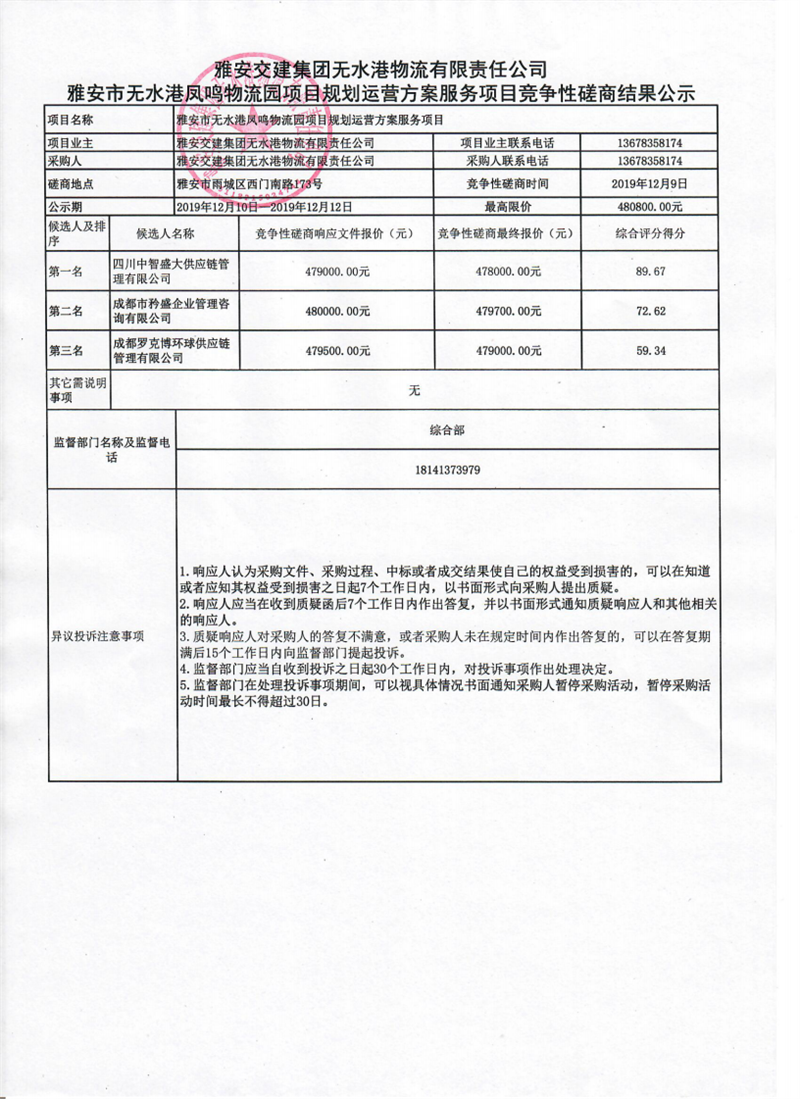 雅安交建集團(tuán)無水港物流有限責(zé)任公司雅安市無水港鳳鳴物流園項(xiàng)目規(guī)劃運(yùn)營方案服務(wù)項(xiàng)目競(jìng)爭(zhēng)性磋商結(jié)果公示