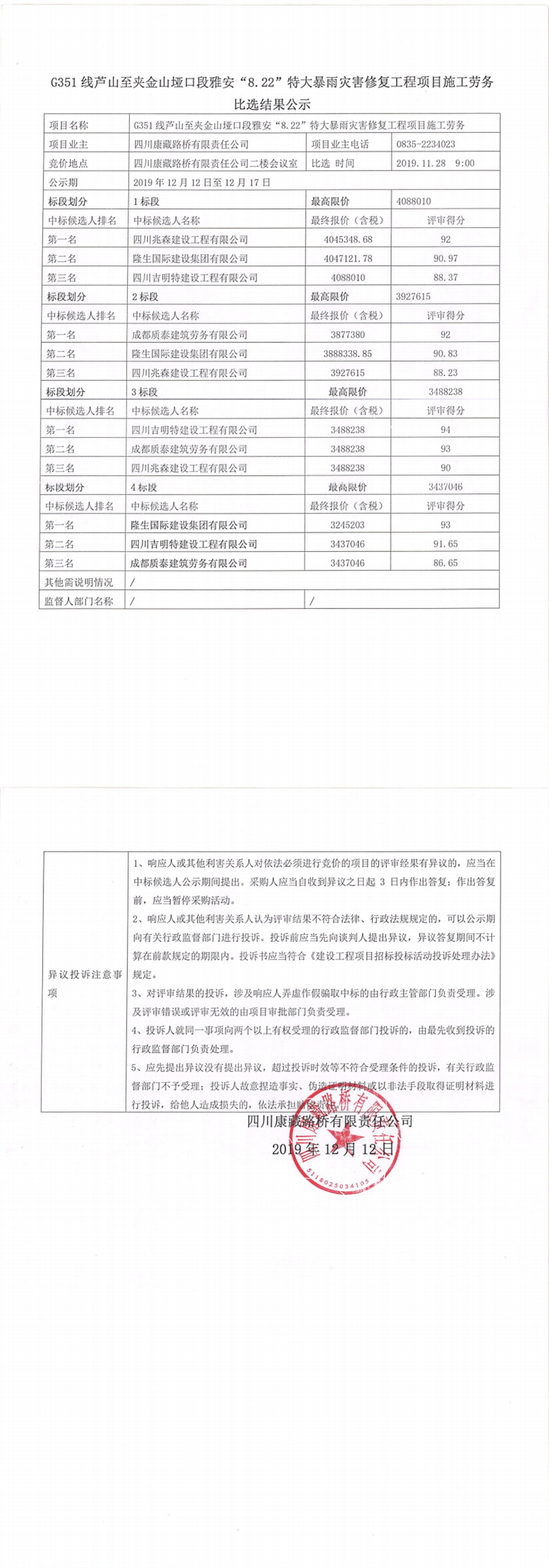 四川康藏路橋有限責任公司G351線蘆山至夾金山埡口段雅安“8.22”特大暴雨災害修復工程項目施工勞務比選結果公示