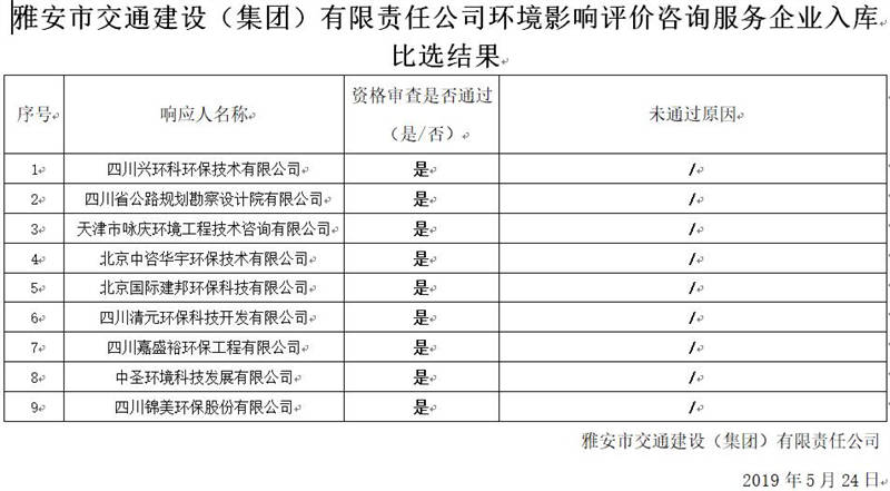 雅安市交通建設(集團)有限責任公司環(huán)境影響評價咨詢服務企業(yè)入庫比選結(jié)果公示
