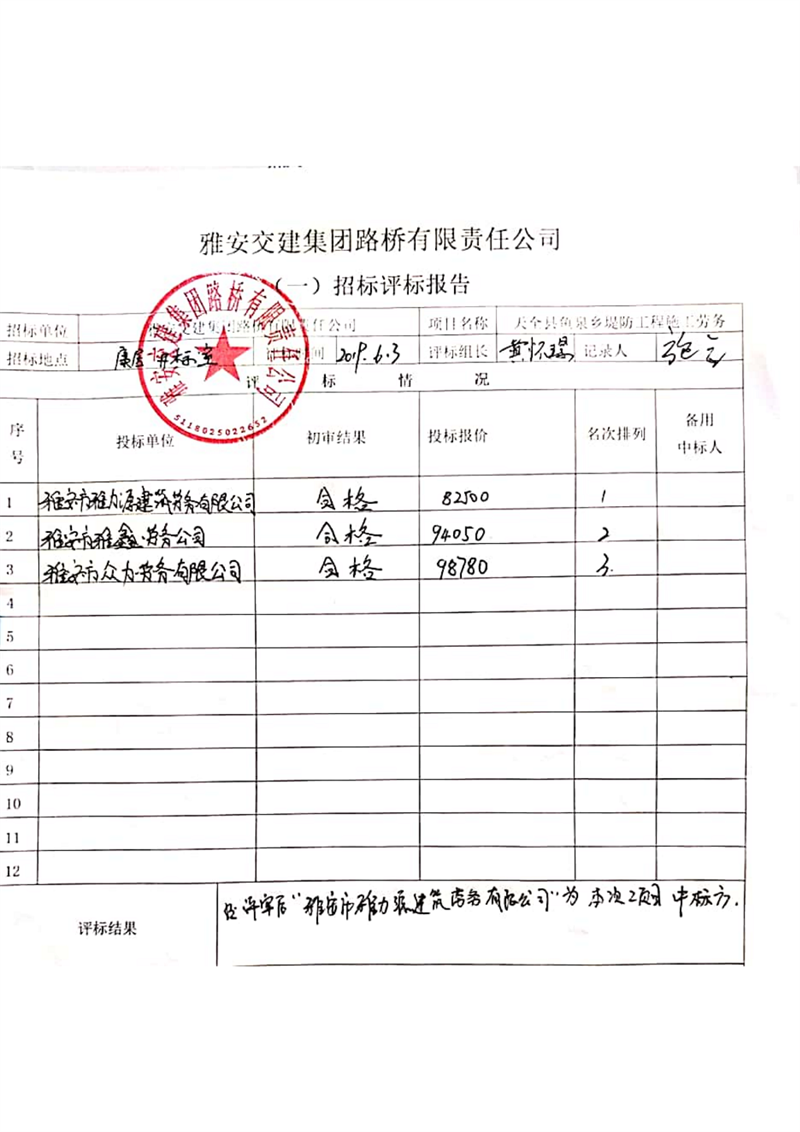 雅安交建集團(tuán)路橋有限責(zé)任公司天全縣魚泉鄉(xiāng)堤防工程施工勞務(wù)項目邀請招標(biāo)結(jié)果公示
