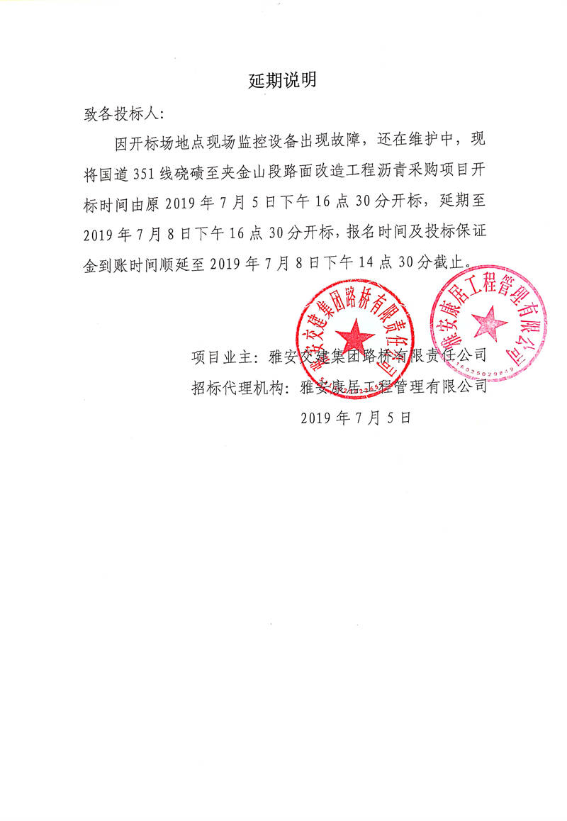 雅安交建集團(tuán)路橋有限責(zé)任公司國道351線磽磧至夾金山段路面改造工程瀝青采購招標(biāo)延期說明
