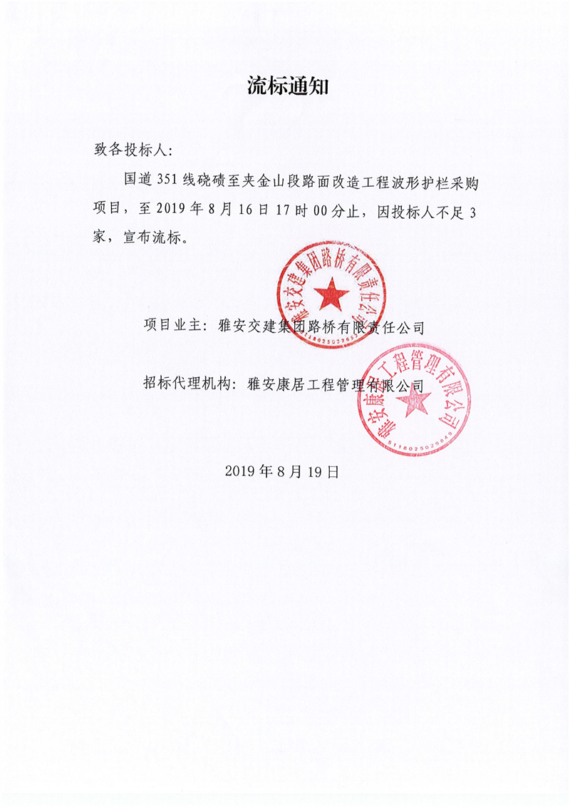 雅安交建集團路橋有限責(zé)任公司國道351線磽磧至夾金山段路面改造工程波形護欄采購項目流標(biāo)通知
