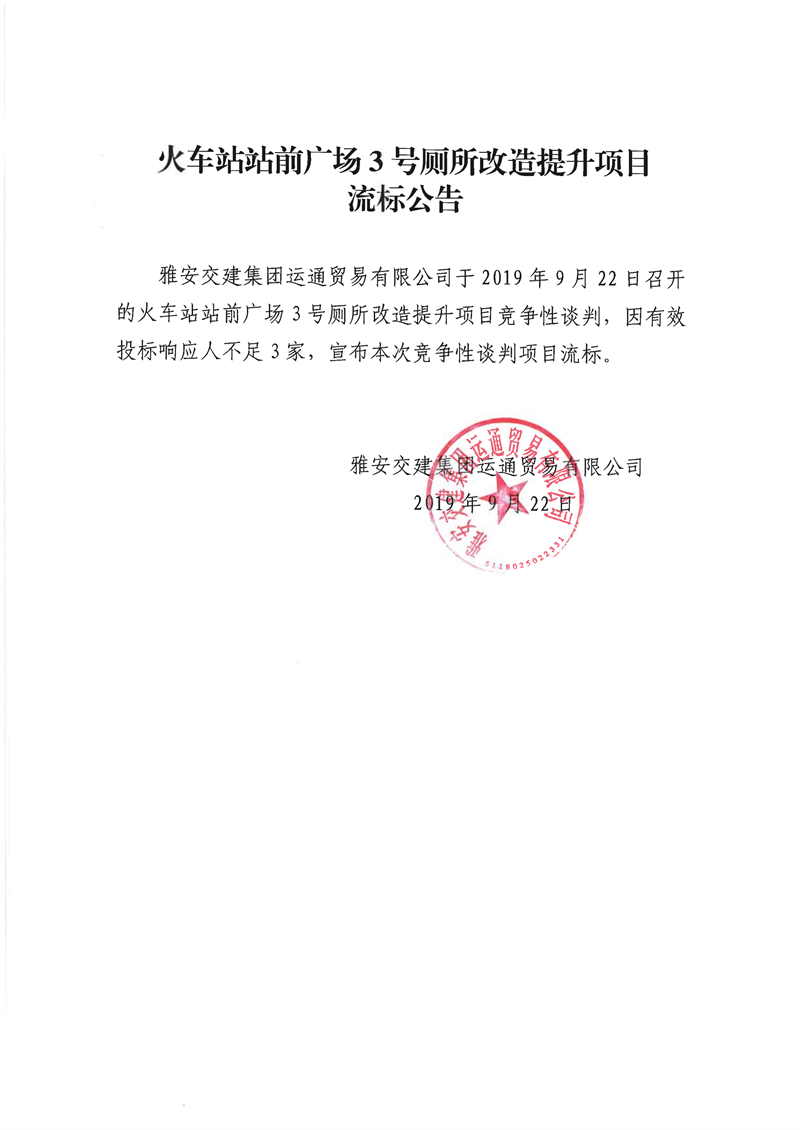 雅安交建集團(tuán)運(yùn)通貿(mào)易有限公司火車站站前廣場3號廁所改造提升項(xiàng)目流標(biāo)公告