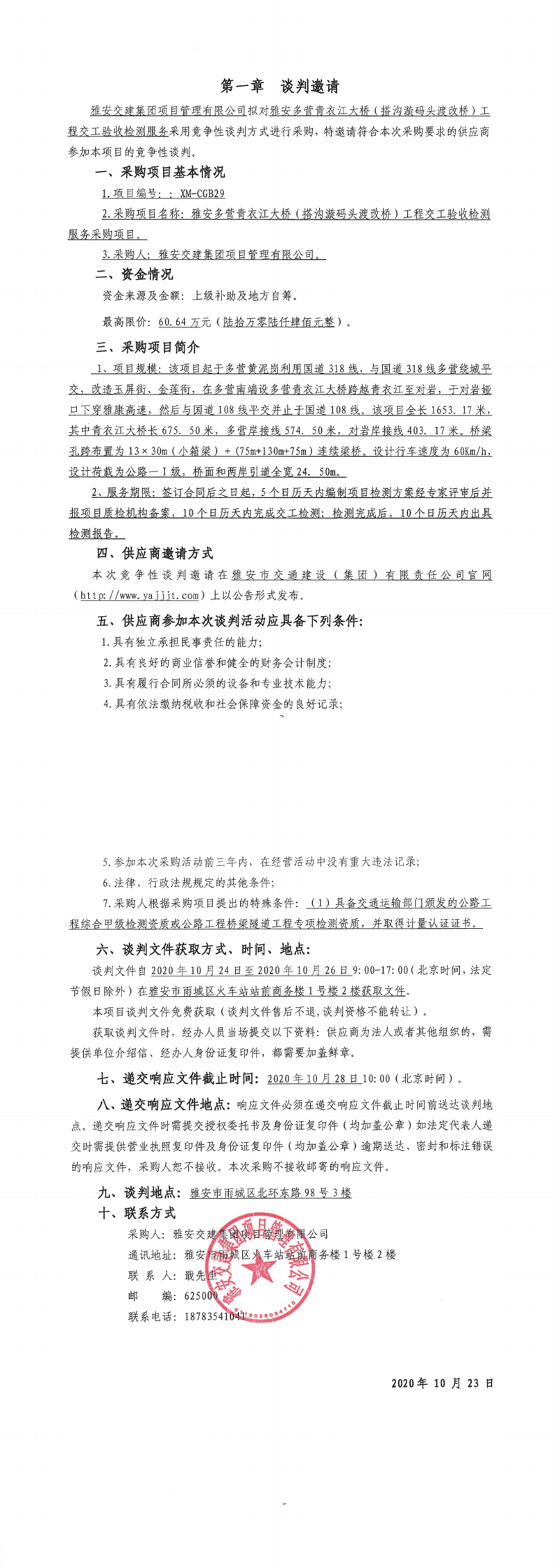 雅安交建集團(tuán)項目管理有限公司雅安多營青衣江大橋(搭溝漩碼頭渡改橋)工程交工驗收檢測服務(wù)采購項目競爭性談判公告