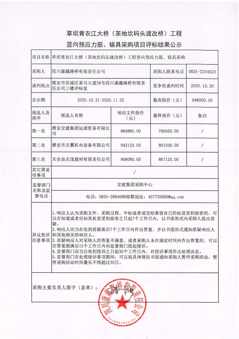四川康藏路橋有限責(zé)任公司草壩青衣江大橋(茶地坎碼頭渡改橋)工程豎向預(yù)應(yīng)力筋、錨具采購項(xiàng)目評標(biāo)結(jié)果公示