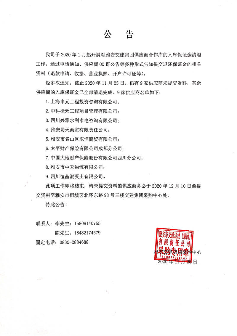 關(guān)于雅安交建集團供應(yīng)商合作庫入庫保證金清退相關(guān)事宜的公告