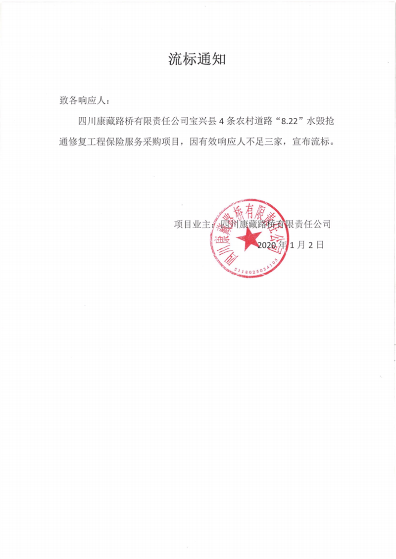 四川康藏路橋有限責任公司寶興縣4條農村道路“8.22”水毀搶通修復工程保險服務采購項目流標通知