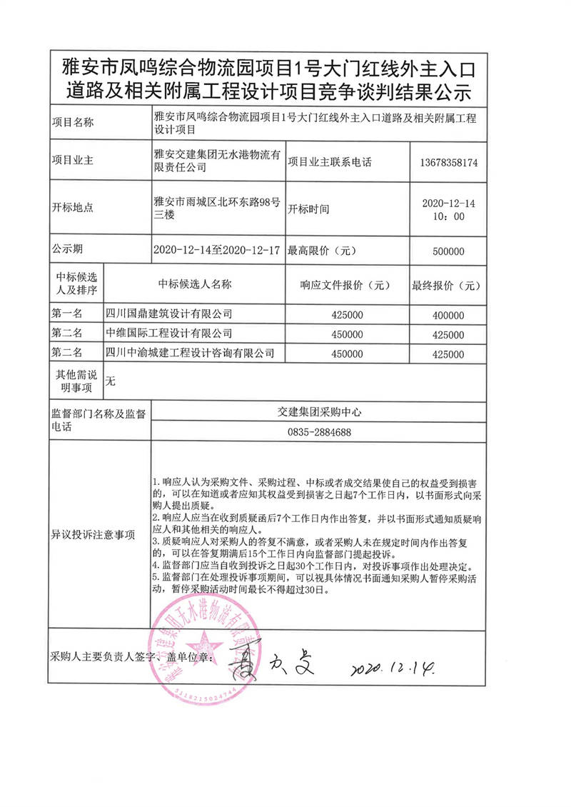 雅安交建集團(tuán)無水港物流有限責(zé)任公司雅安市鳳鳴綜合物流園項(xiàng)目1號(hào)大門紅線外主入口道路及相關(guān)附屬工程設(shè)計(jì)項(xiàng)目談判結(jié)果公示