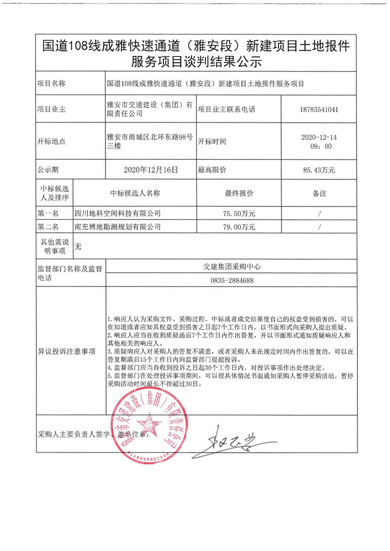 雅安市交通建設(shè)(集團)有限責任公司國道108線成雅快速通道(雅安段)新建項目土地報件服務(wù)項目談判結(jié)果公示