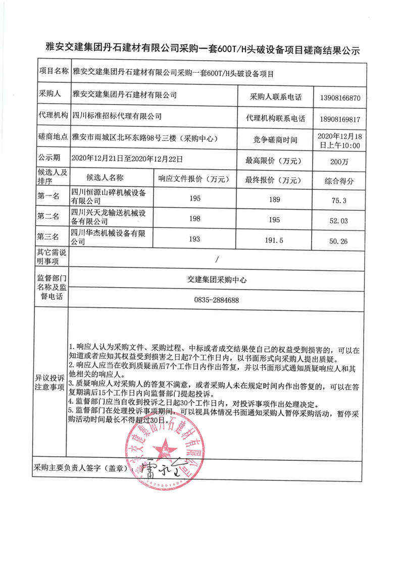 雅安交建集團丹石建材有限公司采購一套600T/H頭破設(shè)備項目磋商結(jié)果公示