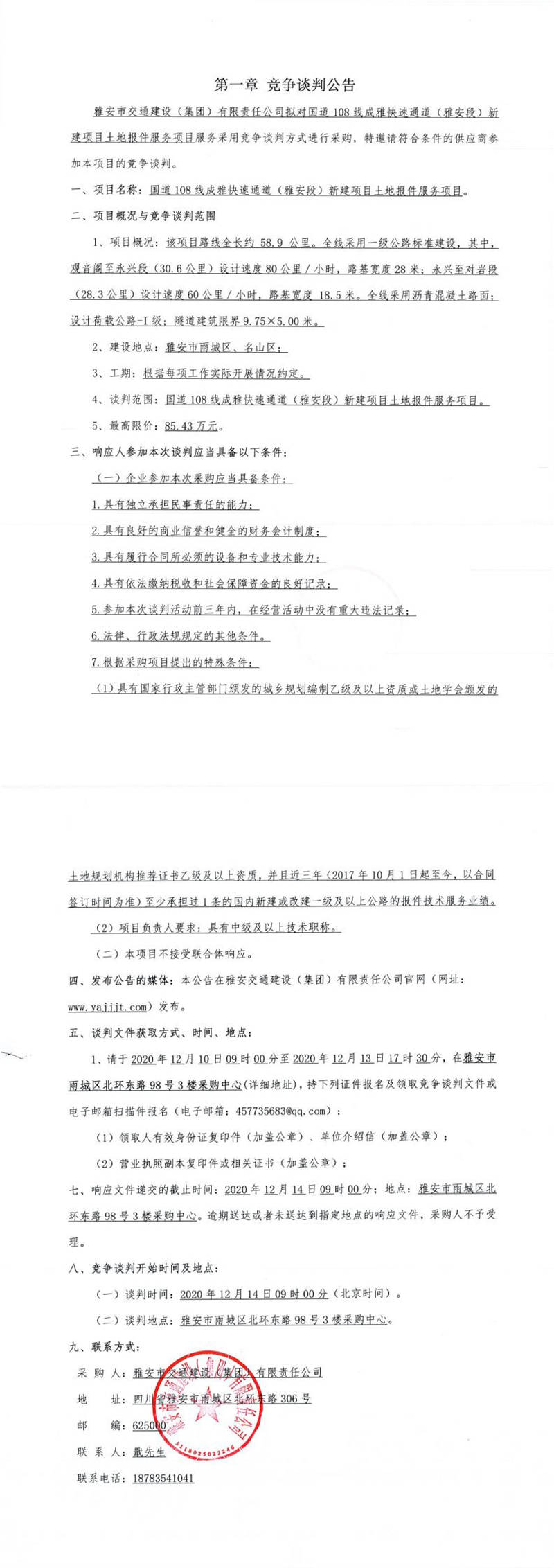 雅安市交通建設(shè)(集團(tuán))有限責(zé)任公司國道108線成雅快速通道(雅安段)新建項(xiàng)目土地報(bào)件服務(wù)項(xiàng)目競(jìng)爭(zhēng)談判公告