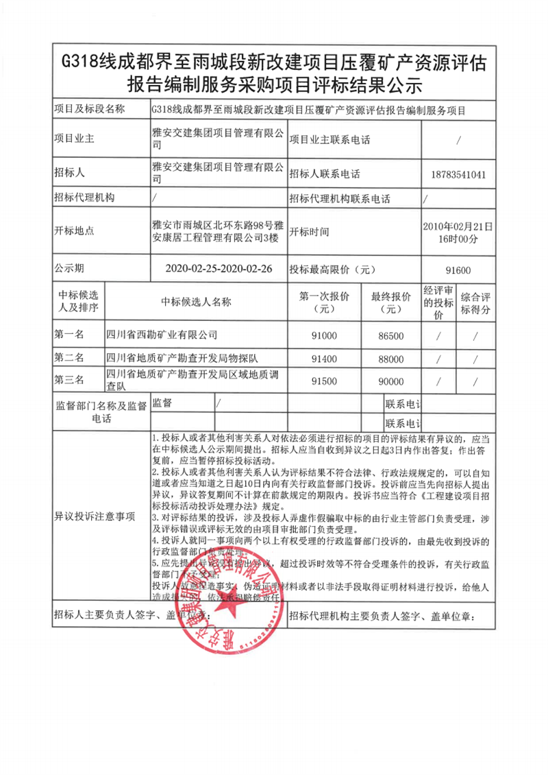 雅安交建集團(tuán)項(xiàng)目管理有限公司G318線成都界至雨城段新改建項(xiàng)目壓覆礦產(chǎn)資源評(píng)估報(bào)告編制服務(wù)采購(gòu)項(xiàng)目評(píng)標(biāo)結(jié)果公示