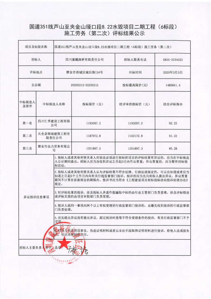 四川康藏路橋有限責(zé)任公司國道351線蘆山至夾金山埡口段8.22水毀項(xiàng)目二期工程(6標(biāo)段)施工勞務(wù)(第二次)評標(biāo)結(jié)果公示