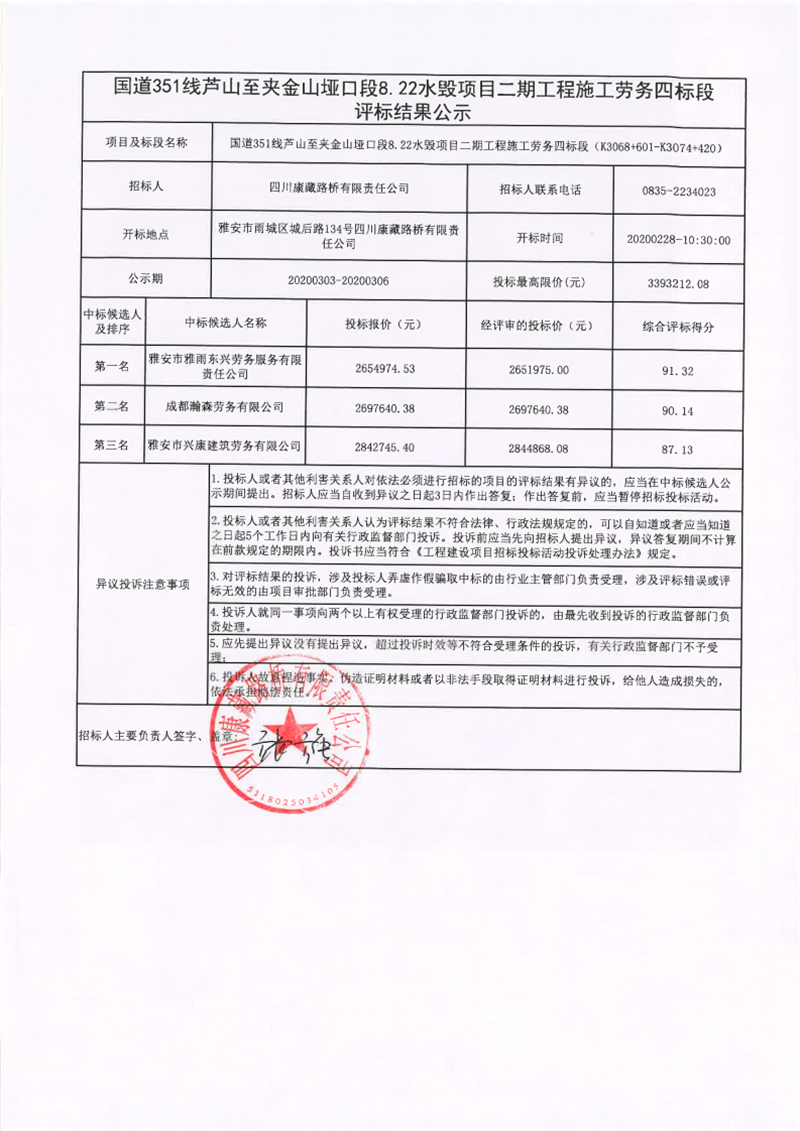 四川康藏路橋有限責任公司國道351線蘆山至夾金山埡口段8.22水毀項目二期工程施工勞務四標段評標結果公示