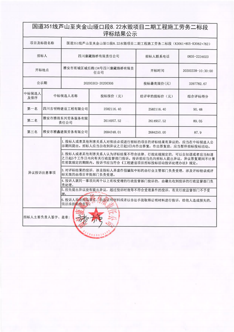 四川康藏路橋有限責任公司國道351線蘆山至夾金山埡口段8.22水毀項目二期工程施工勞務二標段評標結果公示