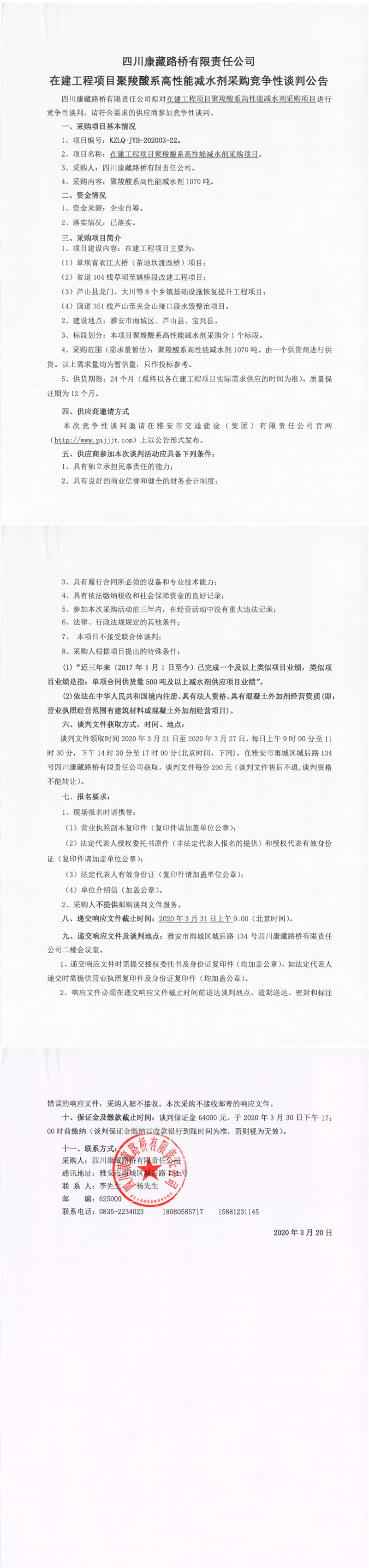 四川康藏路橋有限責(zé)任公司在建工程項(xiàng)目聚羧酸系高性能減水劑采購競(jìng)爭(zhēng)性談判公告