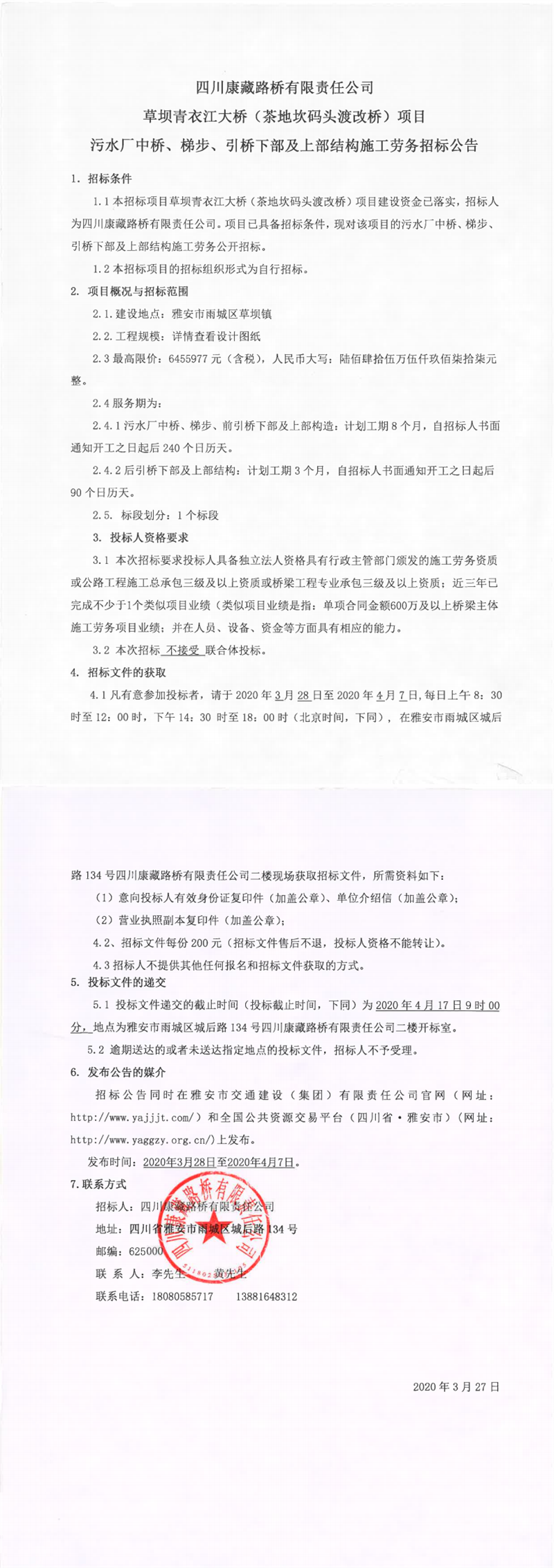 四川康藏路橋有限責任公司草壩青衣江大橋(茶地坎碼頭渡改橋)項目污水廠中橋、梯步、引橋下部及上部結構施工勞務招標公告
