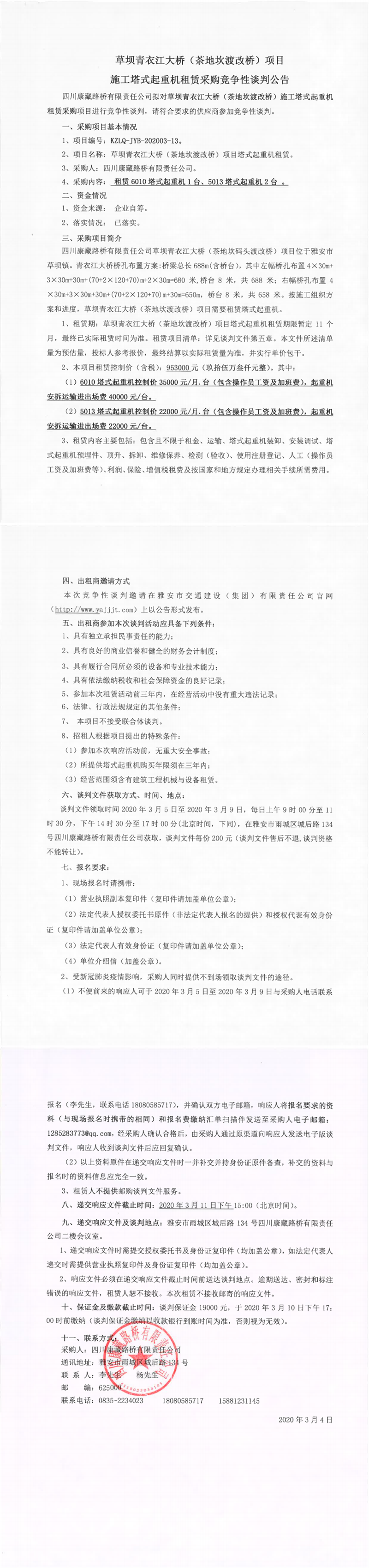 四川康藏路橋有限責(zé)任公司草壩青衣江大橋(茶地坎渡改橋)項目施工塔式起重機租賃采購競爭性談判公告