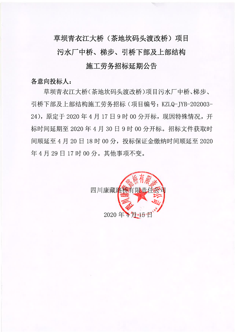 四川康藏路橋有限責任公司草壩青衣江大橋(茶地坎碼頭渡改橋)項目污水廠中橋、梯步、引橋下部及上部結構施工勞務招標延期公告