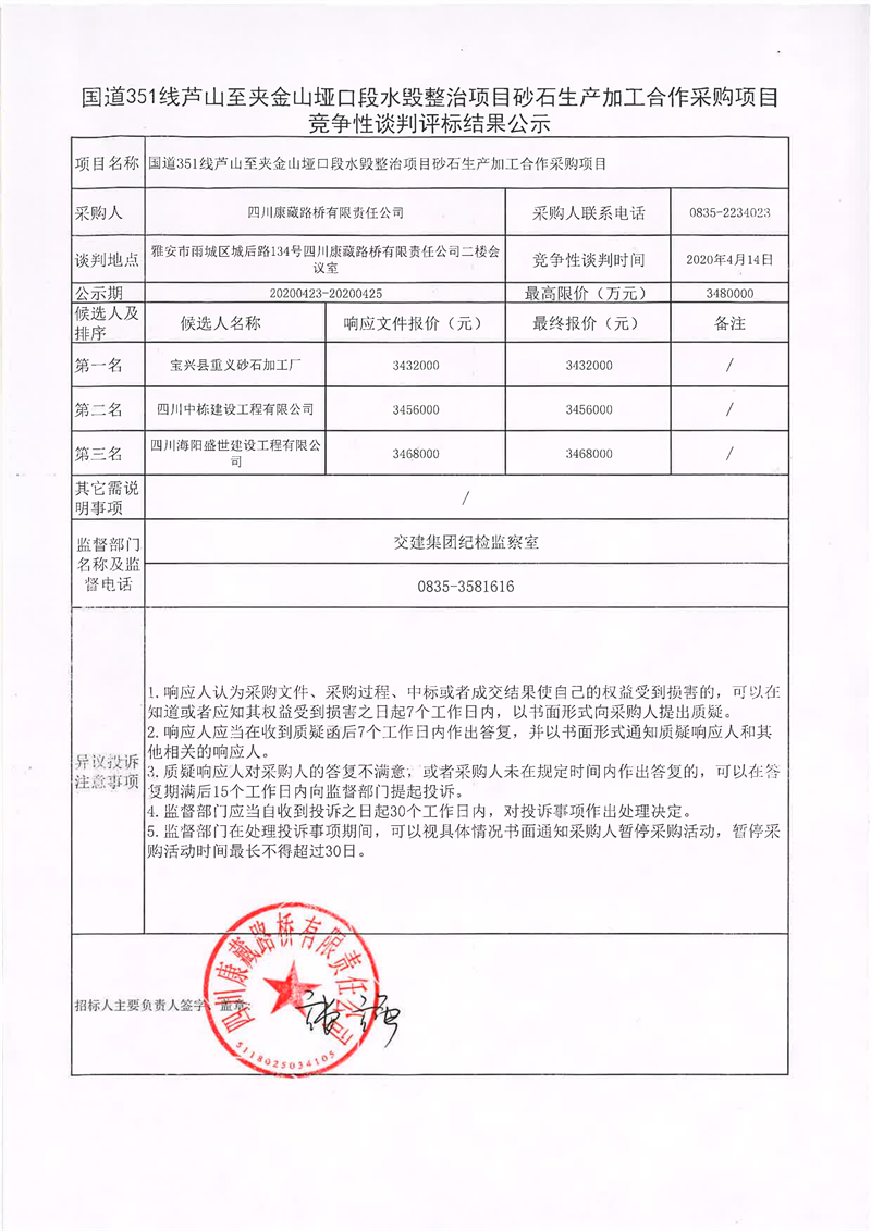 四川康藏路橋有限責(zé)任公司國道351線蘆山至夾金山埡口段水毀整治項目砂石生產(chǎn)加工合作采購項目競爭性談判評標(biāo)結(jié)果公示