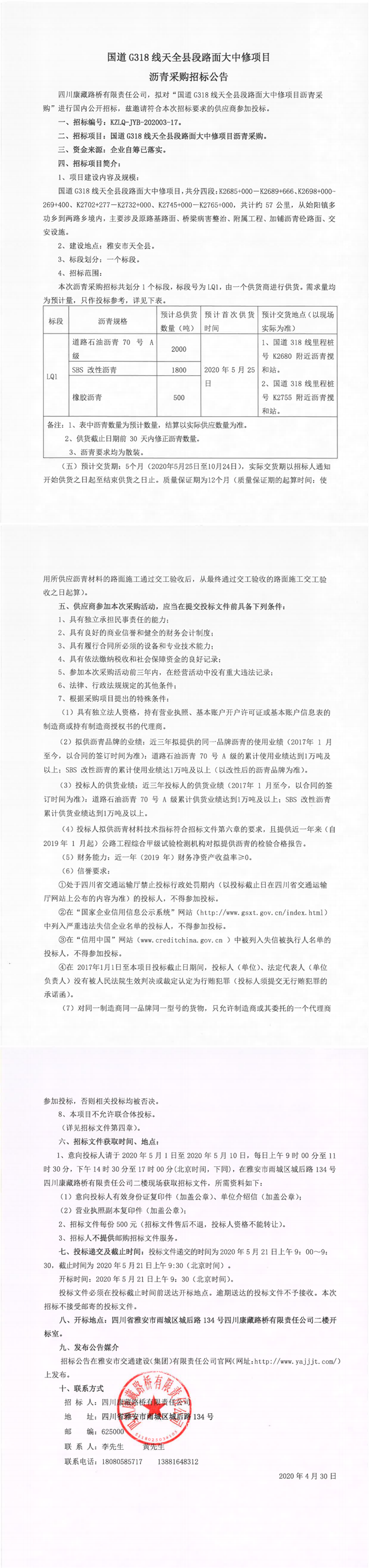 四川康藏路橋有限責(zé)任公司國道G318線天全縣段路面大中修項目瀝青采購招標公告