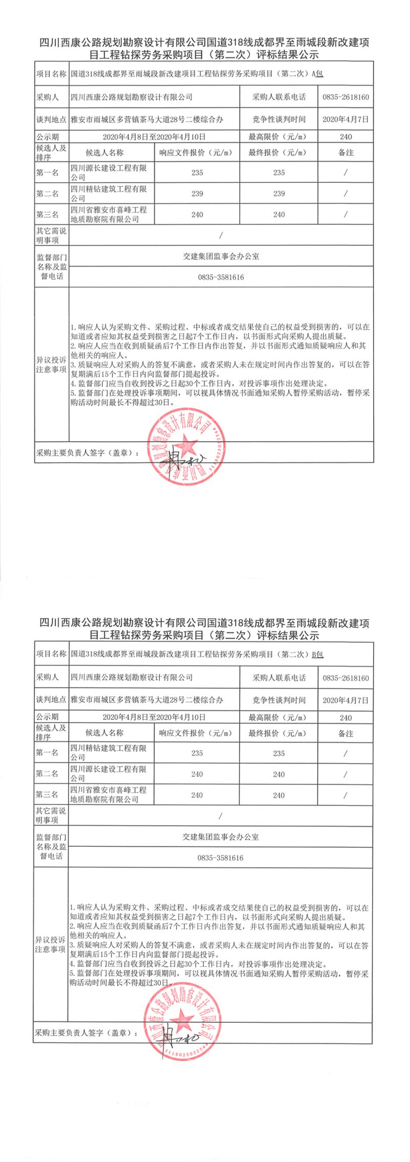 四川西康公路規(guī)劃勘察設(shè)計(jì)有限公司國道318線成都界至雨城段新改建項(xiàng)目工程鉆探勞務(wù)采購項(xiàng)目(第二次)評(píng)標(biāo)結(jié)果公示