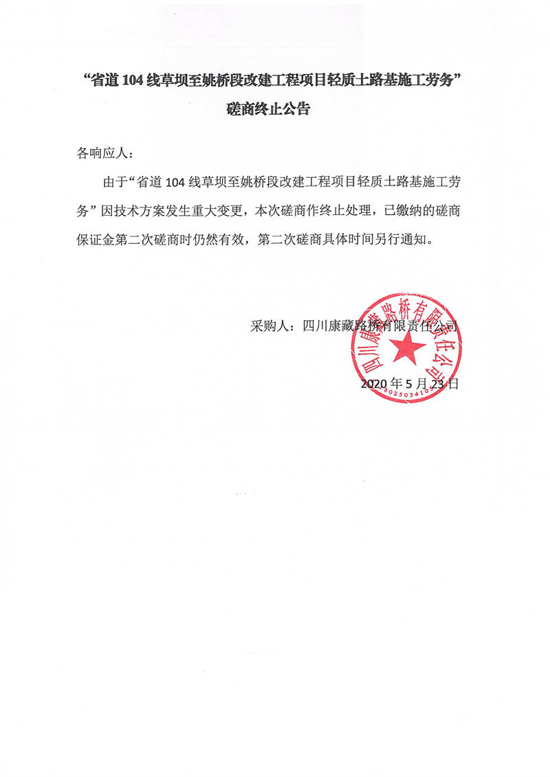 四川康藏路橋有限責任公司省道104線草壩至姚橋段改建工程項目輕質土路基施工勞務磋商終止公告