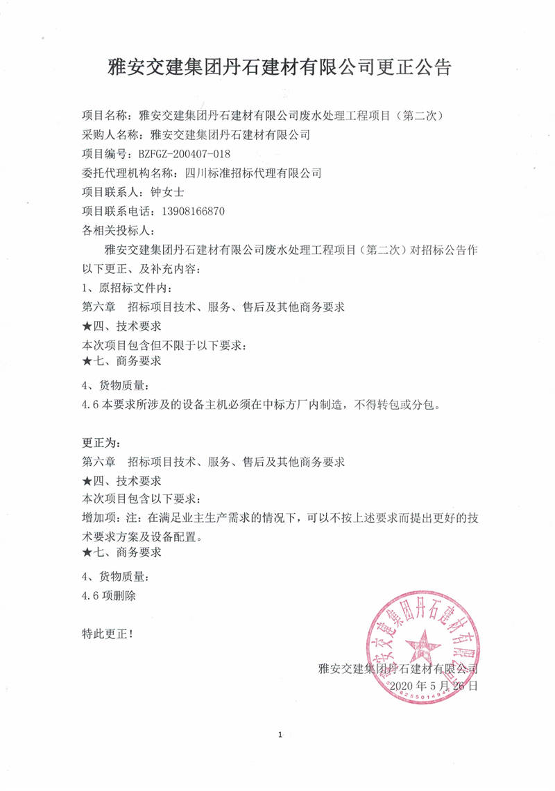雅安交建集團(tuán)丹石建材有限公司廢水處理工程項目(第二次)更正公告