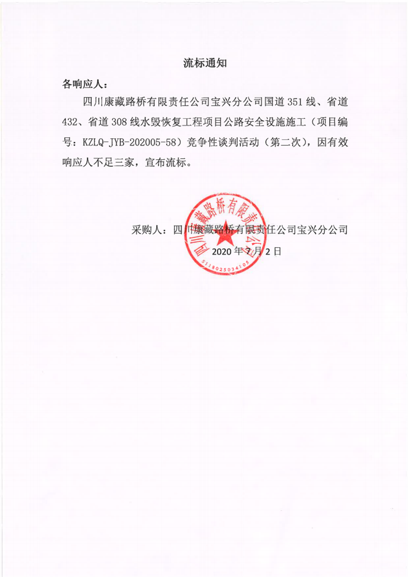 四川康藏路橋有限責(zé)任公司寶興分公司國道351線、省道432線、省道308線水毀恢復(fù)項目公路安全設(shè)施施工競爭性談判(第二次)流標(biāo)通知