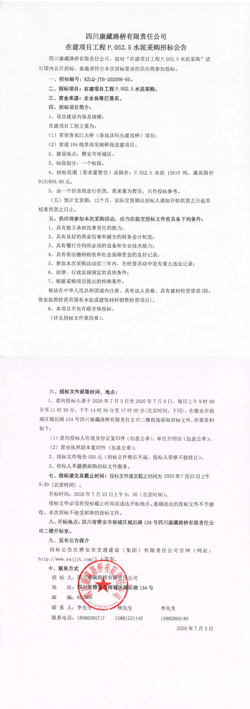 四川康藏路橋有限責(zé)任公司在建項目工程P.052.5水泥采購招標(biāo)公告