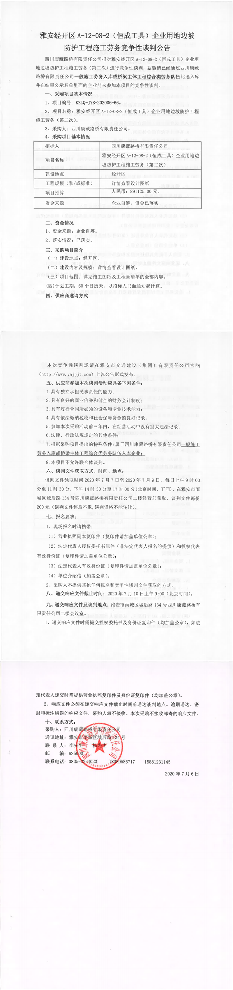 四川康藏路橋有限責任公司雅安經開區(qū)A-12-08-2(恒成工具)企業(yè)用地邊坡防護工程施工勞務(第二次)競爭性談判公告