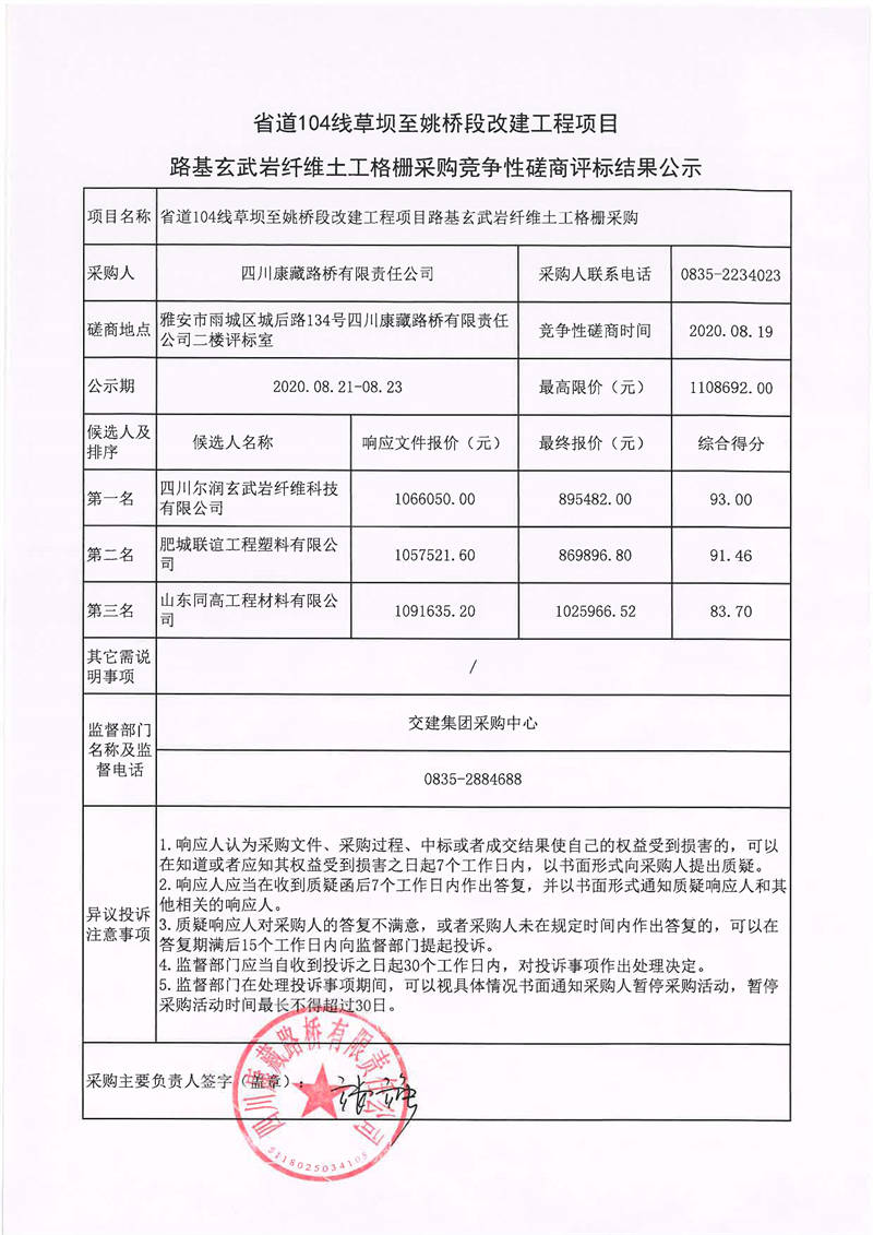 四川康藏路橋有限責(zé)任公司省道104線草壩至姚橋段改建工程項(xiàng)目路基玄武巖纖維土工格柵采購競爭性磋商評(píng)標(biāo)結(jié)果公示