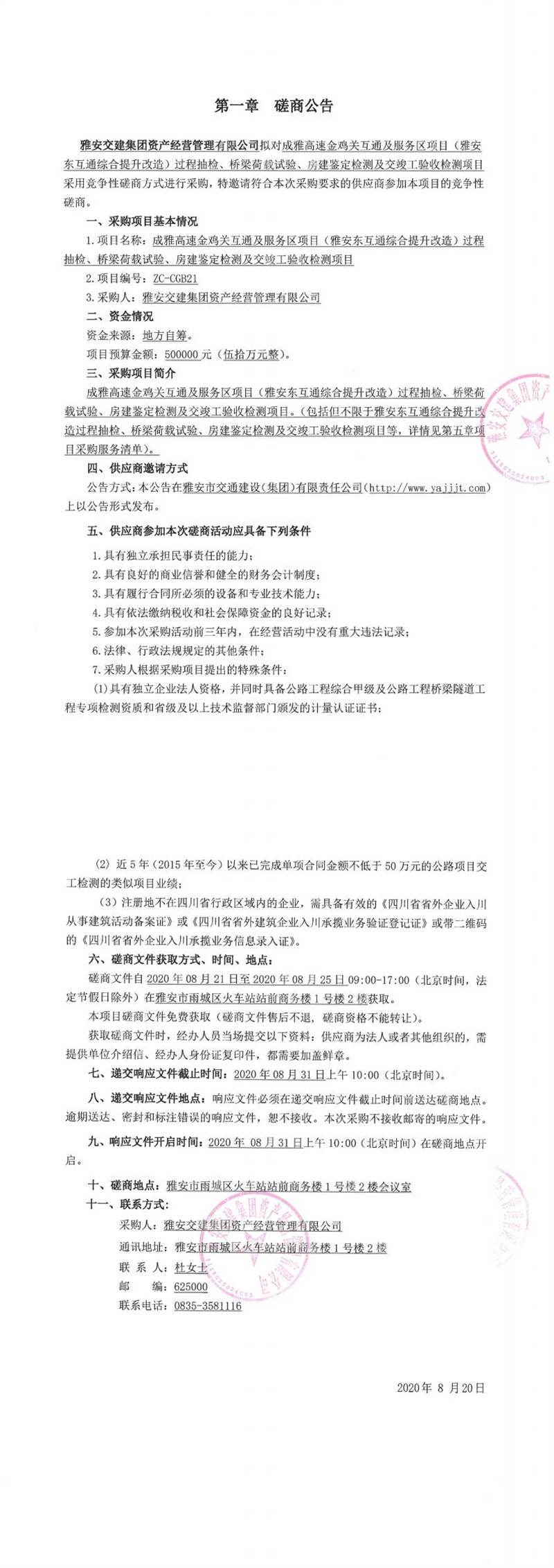 雅安交建集團(tuán)資產(chǎn)經(jīng)營(yíng)管理有限公司成雅高速金雞關(guān)互通及服務(wù)區(qū)項(xiàng)目(雅安東互通綜合提升改造)過(guò)程抽檢、橋梁荷載試驗(yàn)、房建鑒定檢測(cè)及交竣工驗(yàn)收檢測(cè)項(xiàng)目磋商公告