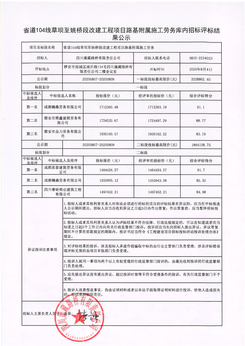 四川康藏路橋有限責(zé)任公司省道104線草壩至姚橋段改建工程項目路基附屬施工勞務(wù)庫內(nèi)招標(biāo)評標(biāo)結(jié)果公示