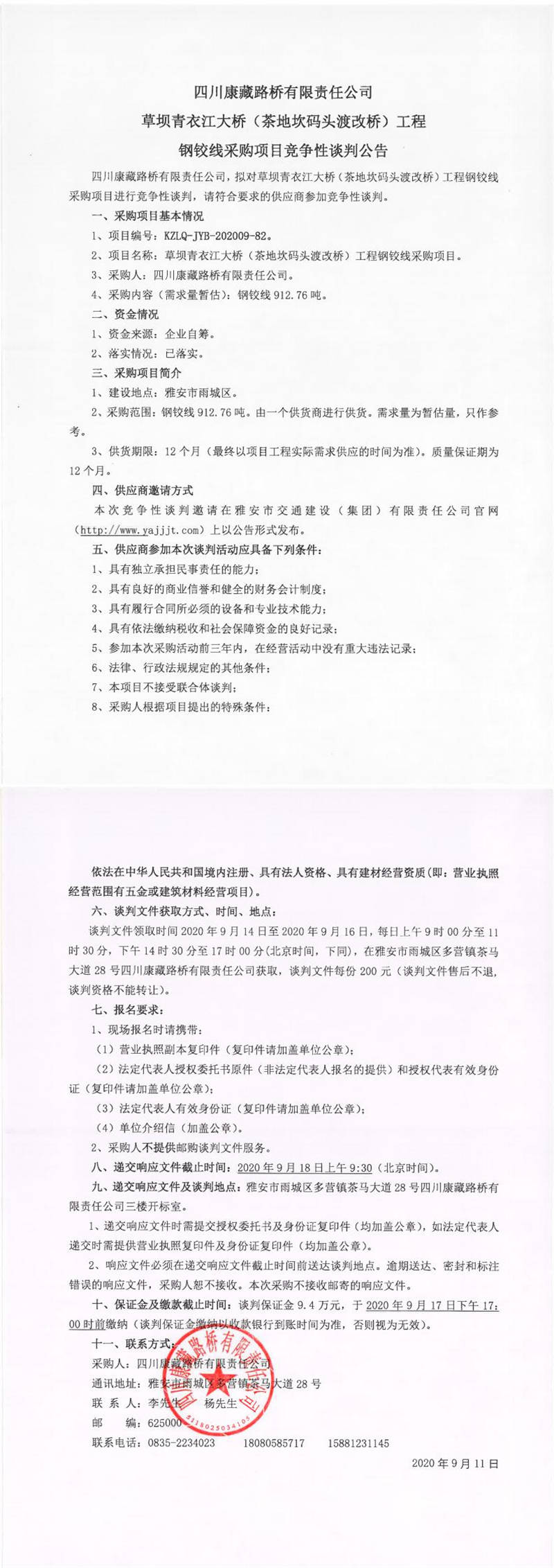 四川康藏路橋有限責任公司草壩青衣江大橋(茶地坎碼頭渡改橋)工程鋼鉸線采購項目競爭性談判公告