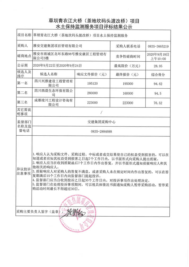 雅安交建集團(tuán)項(xiàng)目管理有限公司草壩青衣江大橋(茶地坎碼頭渡改橋)項(xiàng)目水土保持監(jiān)測服務(wù)項(xiàng)目評(píng)標(biāo)結(jié)果公示