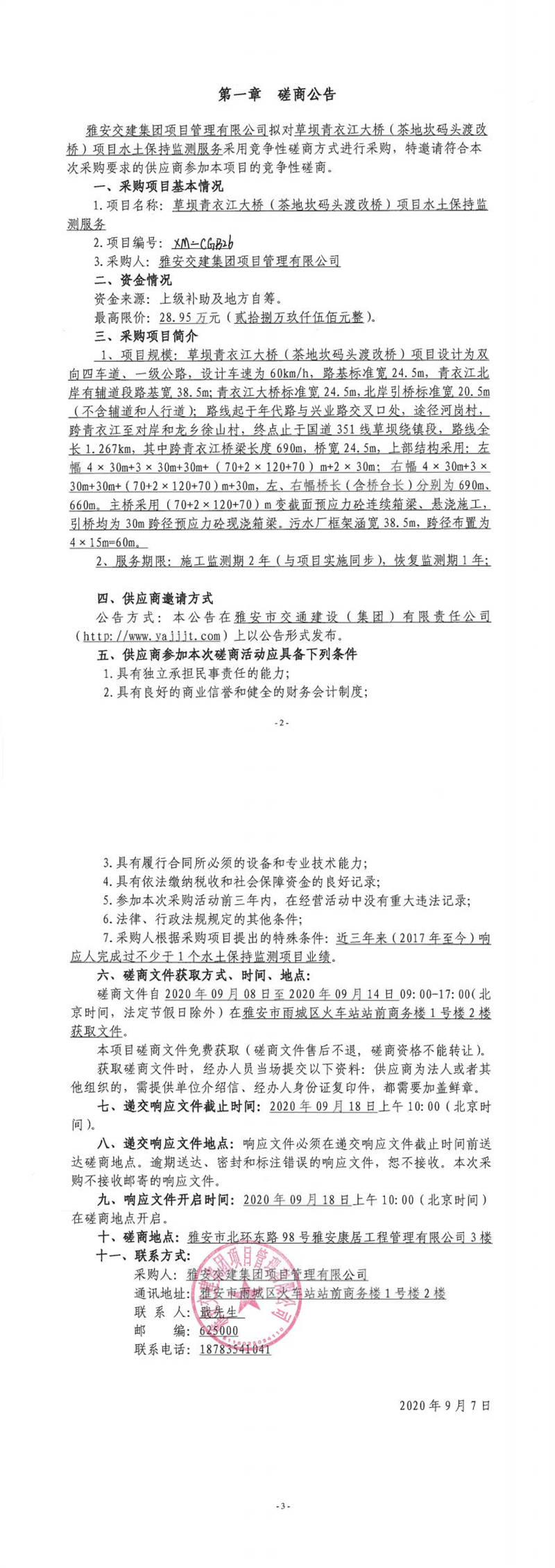 雅安交建集團(tuán)項(xiàng)目管理有限公司草壩青衣江大橋(茶地坎碼頭渡改橋)項(xiàng)目水土保持監(jiān)測(cè)服務(wù)競(jìng)爭(zhēng)性磋商公告