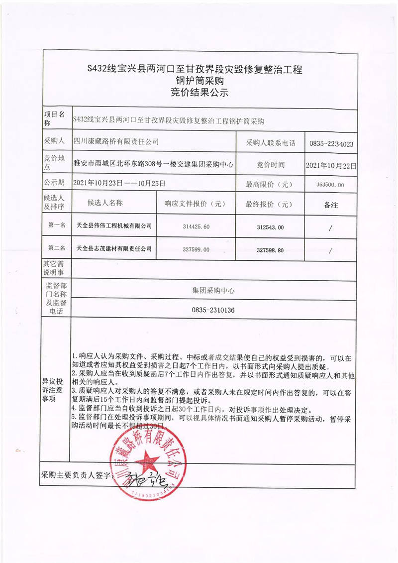 四川康藏路橋有限責任公司S432線寶興縣兩河口至甘孜界段災毀修復整治工程鋼護筒采購競價結果公示