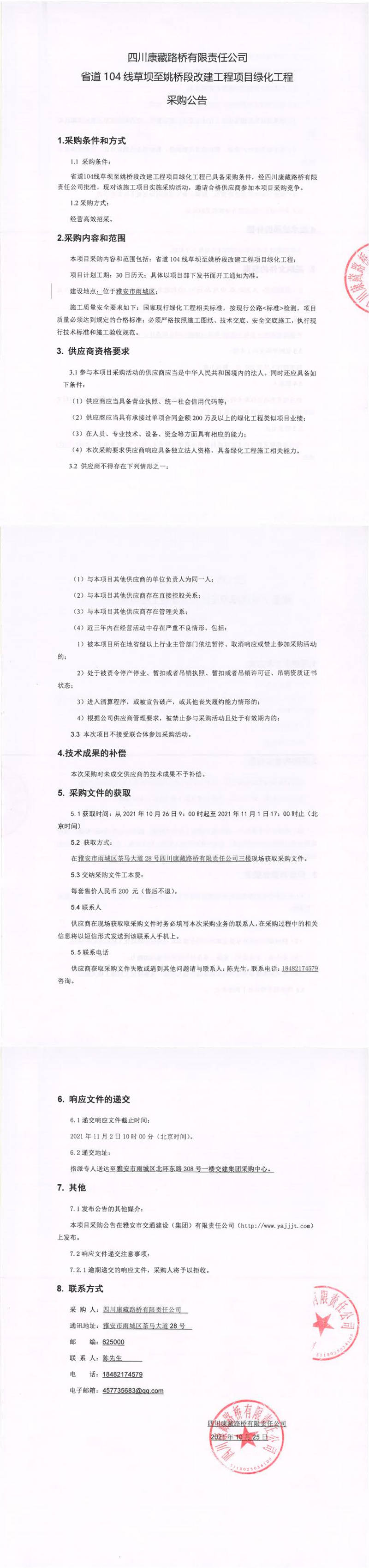 四川康藏路橋有限責(zé)任公司省道104線草壩至姚橋段改建工程項(xiàng)目綠化工程采購公告